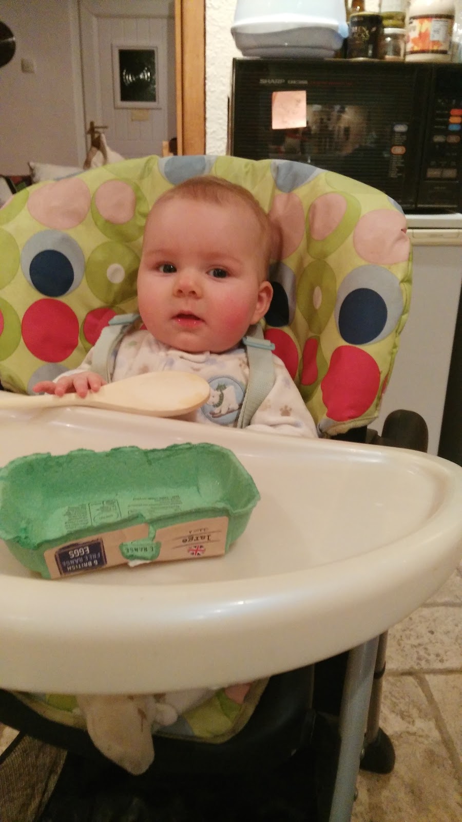We have tried baby rice and pureed carrot so far this week. He's not entirely convinced, but seems happier with carrot than rice. The reason we tried was that he has totally gone off his milk first thing in a morning. He is swallowing it well when I can get it to his mouth without him grabbing the spoon , his face is a picture though; it is a pretty horrified and disgusted look the entire time!